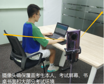③摄像头:考试时手机放置在后方45度角斜位置,保证画面清晰完整,画面中必须包含考试用机的屏幕、桌面、考生侧影;