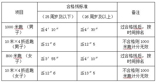 体能测试项目:男子1000米跑、女子800米跑,4×10米往返跑。测试标准参照《公安机关录用人民警察体能测评项目和标准(暂行)》适当放宽。