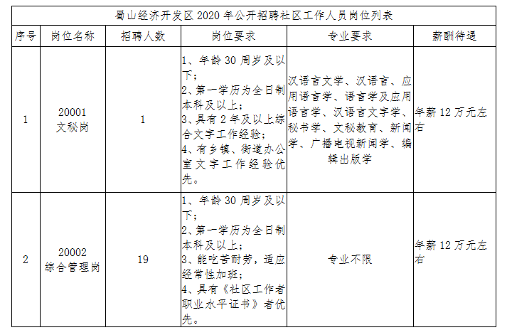 合肥蜀山经济开发区因工作需要,现面向社会公开招聘20名社区工作人员。具体如下: