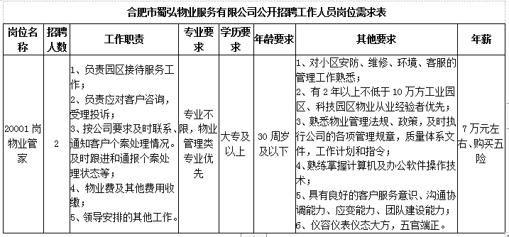 蜀弘物业公司秉承“标准化运营、专业化服务、智能化管理、规模化发展”的经营理念,探索“物业服务+企业服务+属地服务”的服务模式,从业主需求出发,坚持服务初心,树立优秀物业服务品牌。因工作需要,现面向社会公开招聘2名物业管家。具体如下: