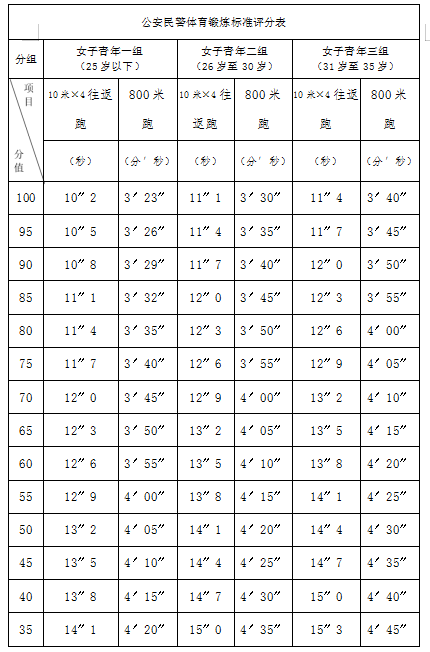 测试标准参照《公安机关录用人民警察体能测评项目和标准》执行。