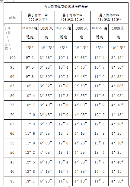纵跳摸高不计成绩,纵跳摸高达到合格标准即视为合格,达不到合格标准者取消进入下一个环节资格。1000米跑或800米跑、10米×4往返跑每项100分。1000米跑、10米×4往返跑两项成绩之和除以2(体测成绩保留小数点后两位)即为体能测评得分。具体评分标准见下表: